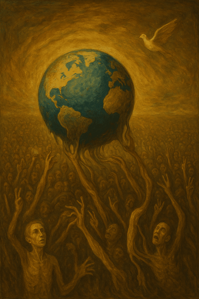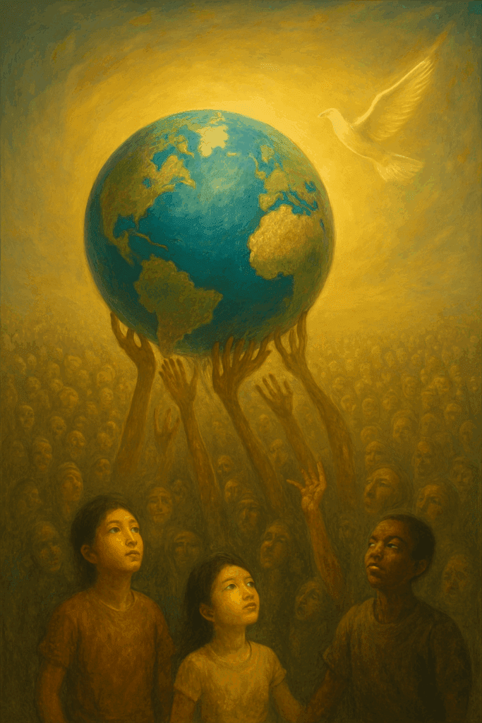 De aarde zelf, stralend in warme tinten blauw en groen, gedragen door licht. Daarboven zweeft een vredesduif in een gouden hemel, badend in symbolisch licht.